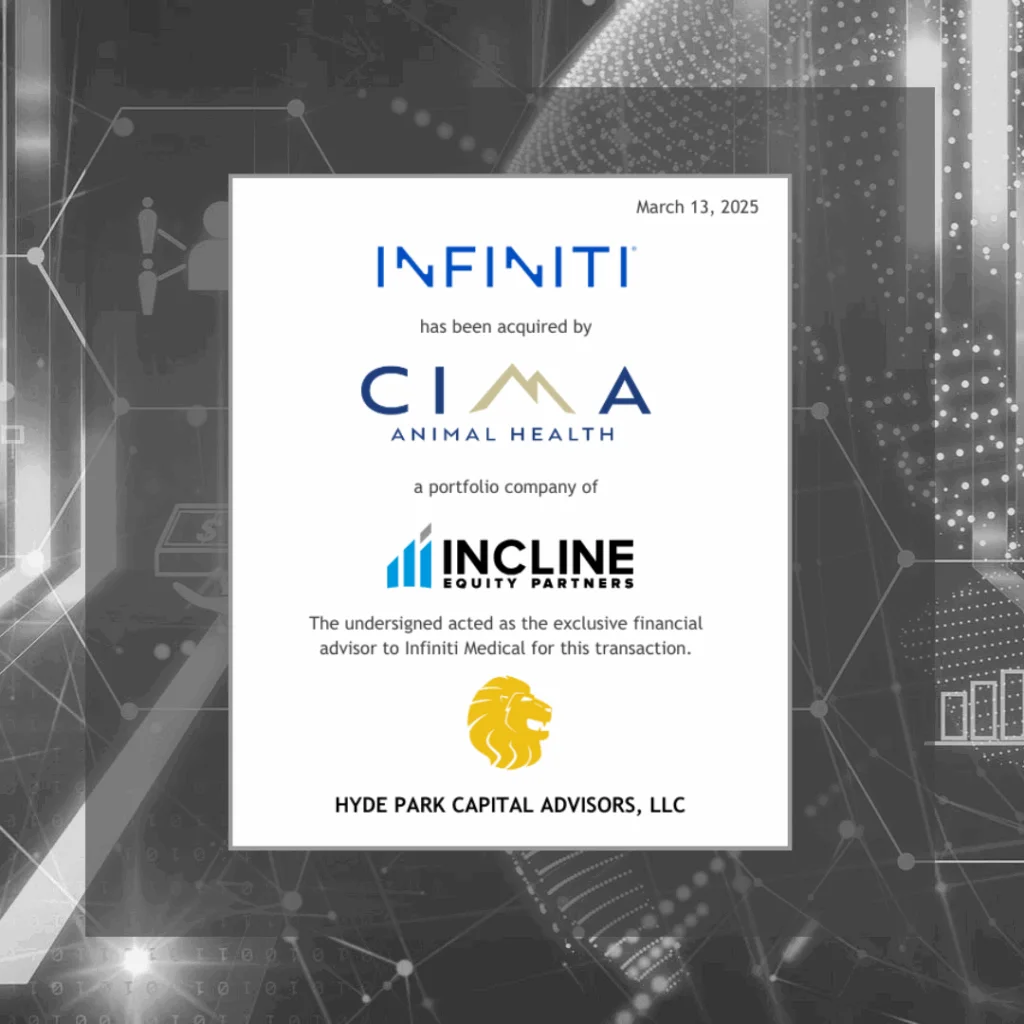 San Francisco, CA – March 13, 2025 – Hyde Park Capital announced today that its client, Infiniti Medical LLC (and its subsidiary Orthomed UK Ltd), two globally recognized brands specializing in veterinary interventional radiology, cardiology, soft tissue surgery, and orthopedics, has been acquired by Creative Science, a CIMA Animal Health company, and a leader in veterinary medical solutions. CIMA Animal Health, a portfolio company of Incline Equity Partners, is dedicated to improving the lives of animals and those who care for them. Hyde Park Capital, led by Managing Director Craig Lawson, served as the exclusive financial advisor to Infiniti Medical for this transaction.